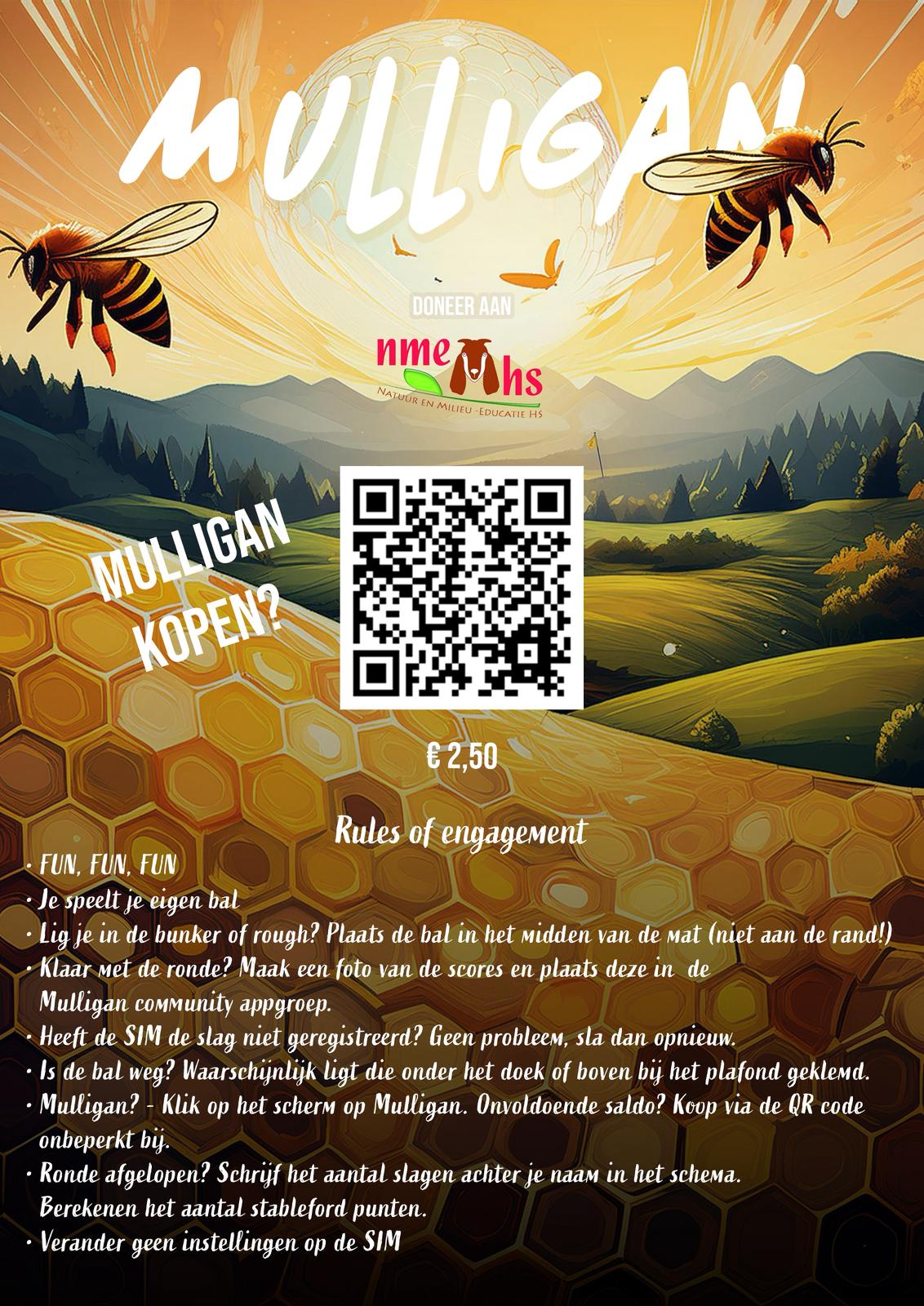 Op de vrijdagavond wordt vanaf 31 Oktober 2025 de Mulligan golf Sim competitie gespeeld op de aboutGolf simulator. Een groep golfers met verschillende handicaps spelen tot en met 24 April 2026 een stableford (strokeplay) wedstrijd. Er wordt door elk van de golfers 3 avonden 9 holes gespeeld en op 24 April is er een finaledag voor elke deelnemer met fun games en lekkere hapjes. Op elke golfbaan kan je een Mulligan kopen, omdat iedereen een tweede kans verdiend. Pak je die Mulligan… dan even de code scannen voor €2.50 en je doneert dit aan de NME Kinderboerderij waar ze een vlinders en insecten tuin hebben aangelegd. De insecten zijn je dankbaar 🙂 . Ongecompliceerd golfen voor de fun!!